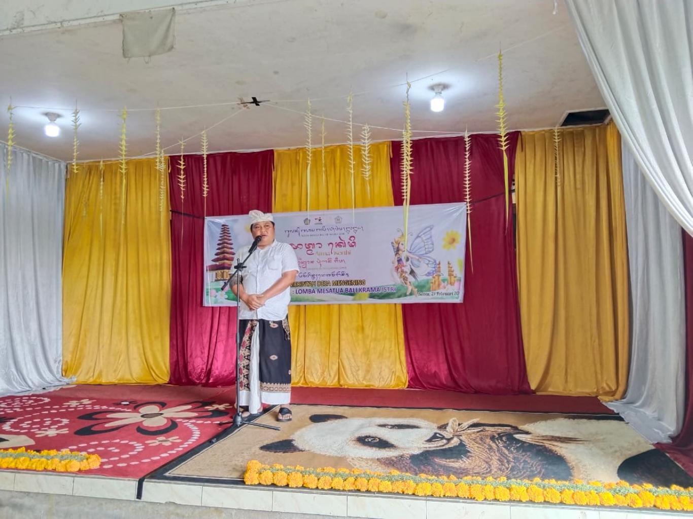 Kegiatan ini diwujudkan melalui Wimbakara Mesatua Bali Krama Istri dan Nyurat Aksara Bali Tingkat SD yang bertempat di Balai Masyarakat Banjar Dinas Sangker hari ini Sabtu (21/2). Hal ini menjadi momentum penting dalam upaya pelestarian bahasa, aksara, dan sastra Bali sebagai warisan adiluhung budaya Bali. Melalui lomba Mesatua Bali krama Istri dan Nyurat Aksara Bali, Masyarakat Desa Mengening diajak untuk lebih mencintai serta memahami nilai-nilai luhur yang terkandung dalam aksara Bali sebagai identitas dan jati diri masyarakat Bali.