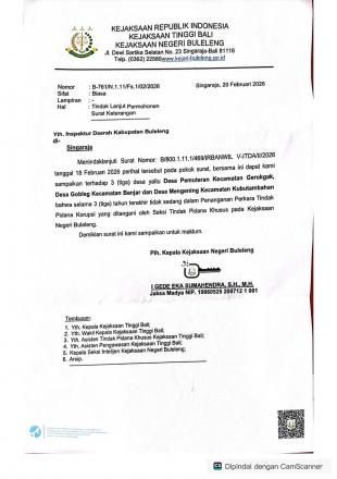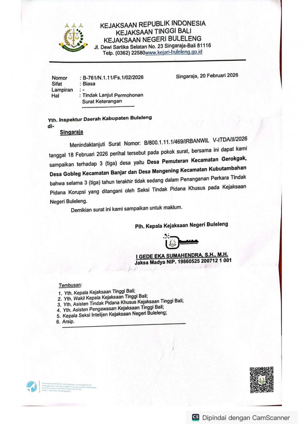 Menindaklanjuti surat dari kejari Kabupaten Buleleng Nomor:B/800.1.11.1/469/IRBANWIL V-ITDA/II/2026, tertanggal 18 Pebruari 2026. Bahwa selama 3 tahun terakhir Desa Mengening tidak sedang dalam penanganan Perkara Tindak Pidana Poruspi yang di tangani oleh Seksi Tindak Pidana Khusus pada Kejaksaan Negeri Buleleng.